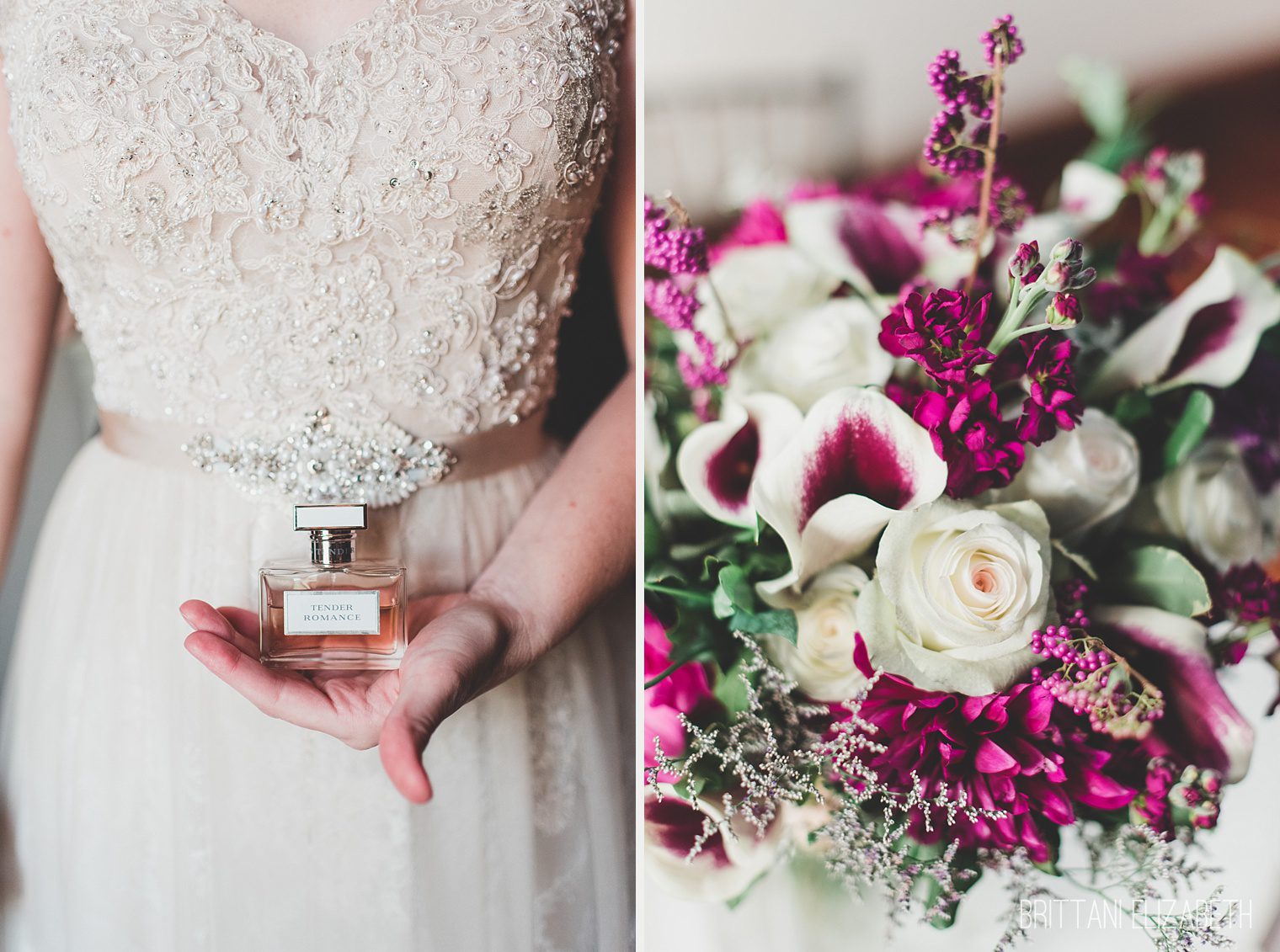 ivory lace wedding dress bride holding perfume purple white bouquet