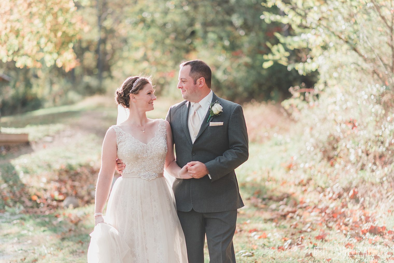 bride and groom outside fall wedding