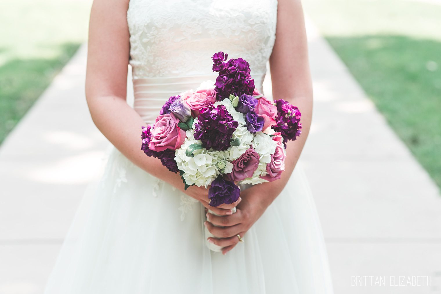 bride holding purple pink white rose hydrangea bouquet