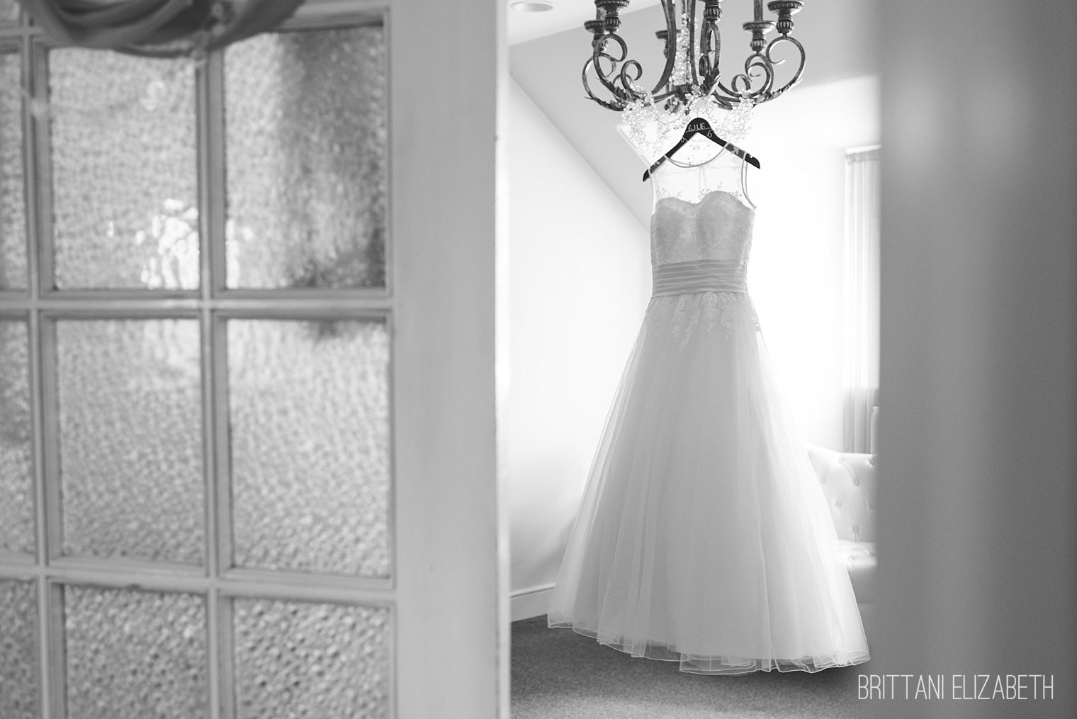 black and white elegant lace wedding dress hanging from chandelier