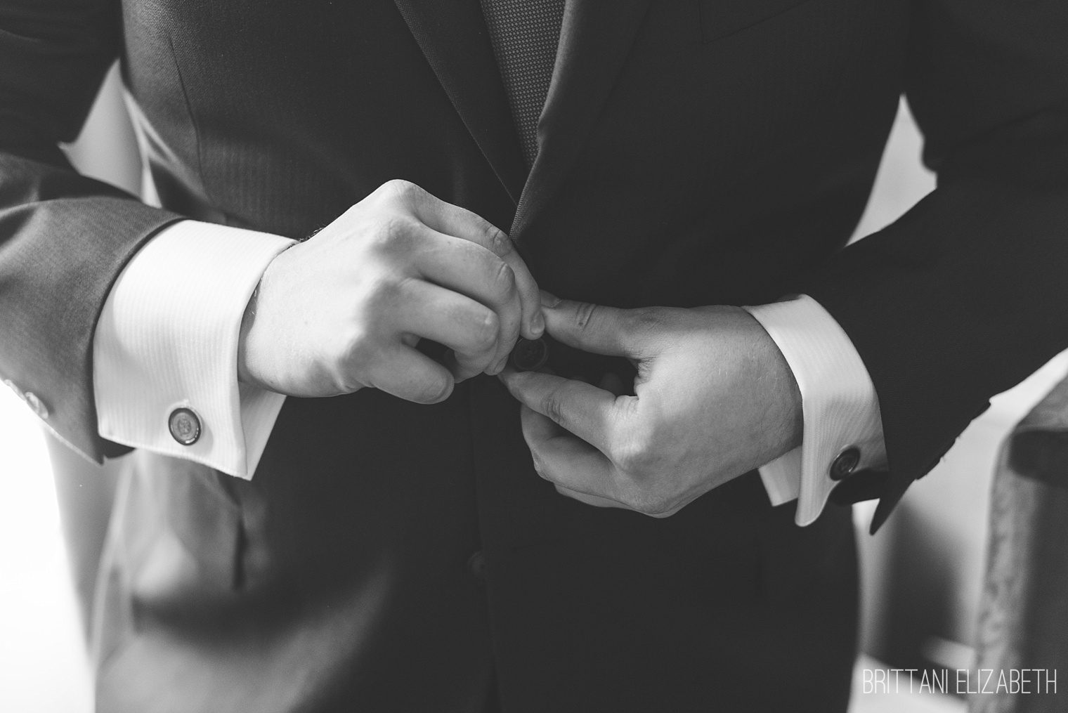 black and white groom getting ready buttoning suit